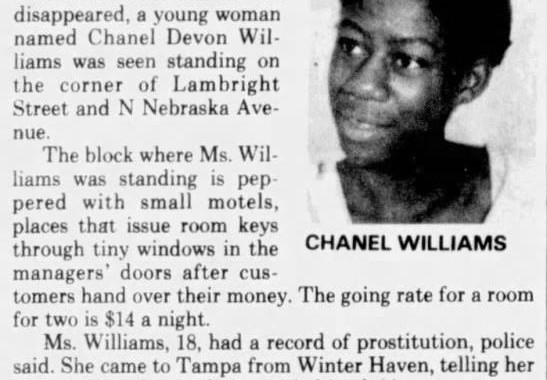 1984年 5月13號,那天是母親節,午後陽光正好,兩個男孩在一處空地玩耍,玩著玩著,聞到空氣中傳來奇怪的味道,他們循著氣味走了幾步,結果被眼前的景象嚇的,大概再也不敢自己跑出來玩了,在路邊的草叢裡,一個女子全身赤裸,雙手與頸部被繩子綑綁,坦帕春天,溫暖的氣候,使得遺體已經開始腐敗。警方與鑑識人員獲報後趕到了現場,研判受害者身亡,已至少3天。法醫鑑定她生前曾被侵犯,並遭兇手勒斃。