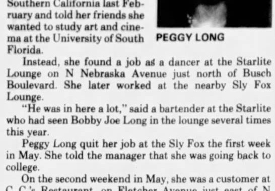 案發隔天,藉著指紋,警方辨認出受害者爲20歲的脫衣舞孃 Lana Peggy Long,她工作的舞廳位與市中心的內布拉斯加大道。內布拉斯加大道,在當時相當於坦帕的紅燈區,那裡俱樂部,舞廳,還有酒店林立,是性工作者時常聚集的地方。